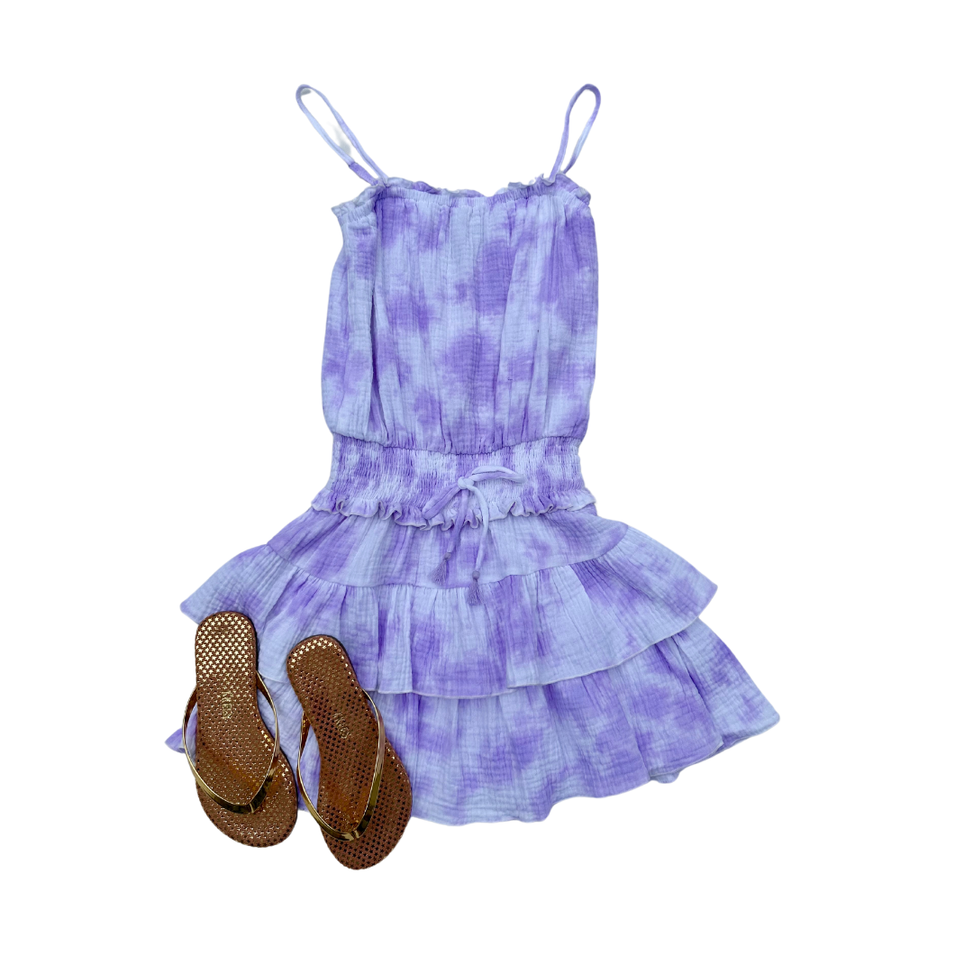 Purple tie-dye ruffle dress, offering a fun and vibrant look with playful ruffles for a perfect tween summer outfit.