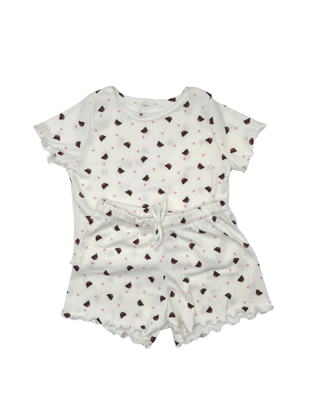 A cozy white lounge set featuring an allover bear and heart print with ruffle trim details. Includes a drawstring waist for the perfect comfy fit.