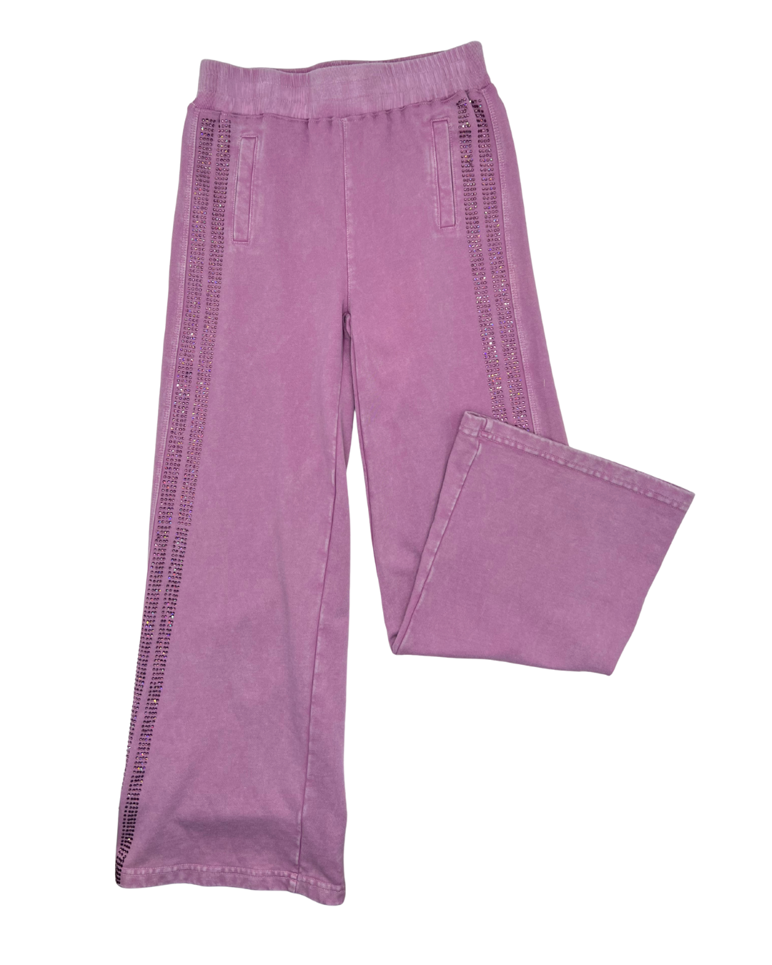 French terry wide leg pant with rhinestone side stripes for comfy style with a hint of glam.