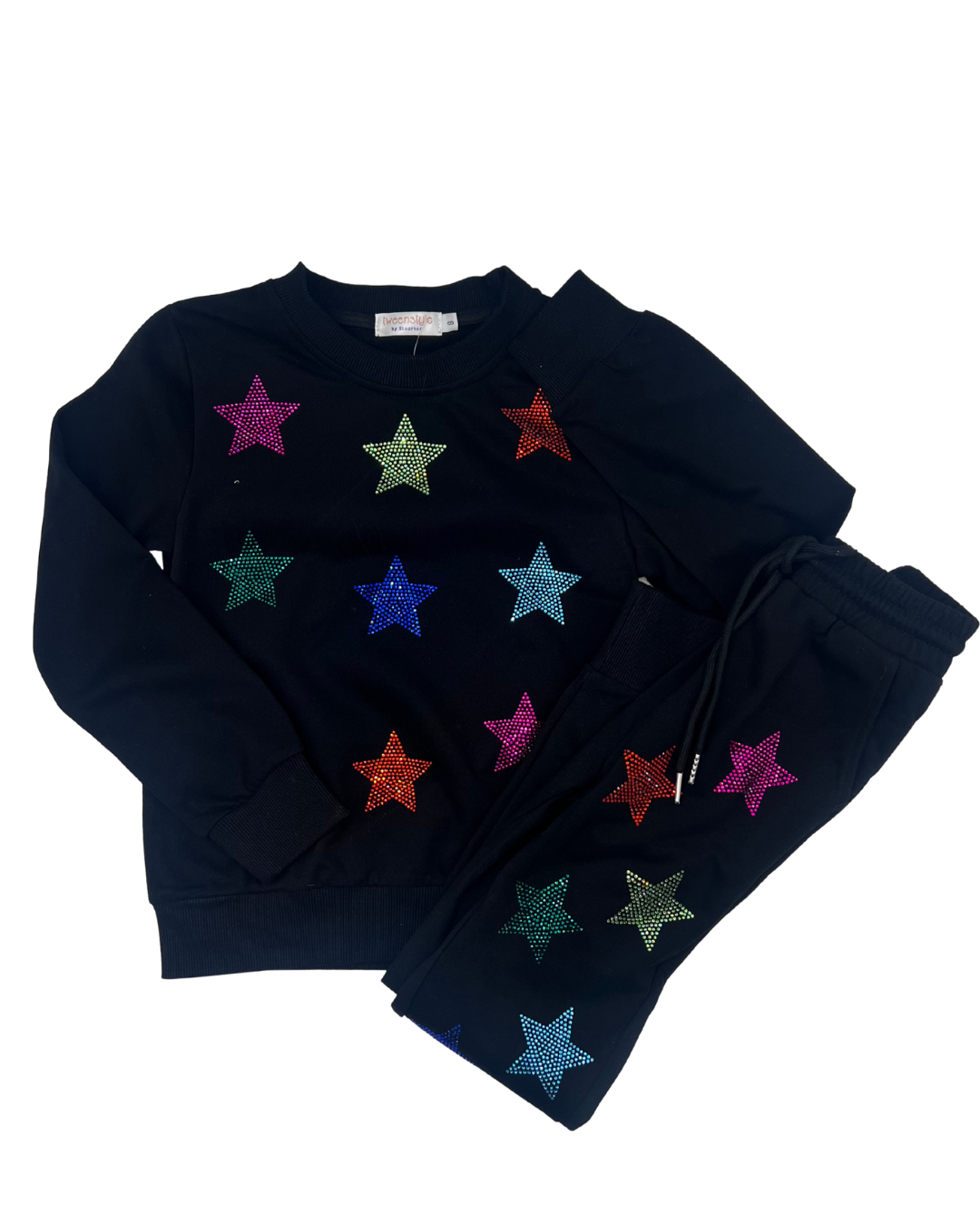 This sequin stars set includes a cozy sweatshirt and matching pull-on joggers with pockets, all decked out in sparkly star details for a fun, standout look.