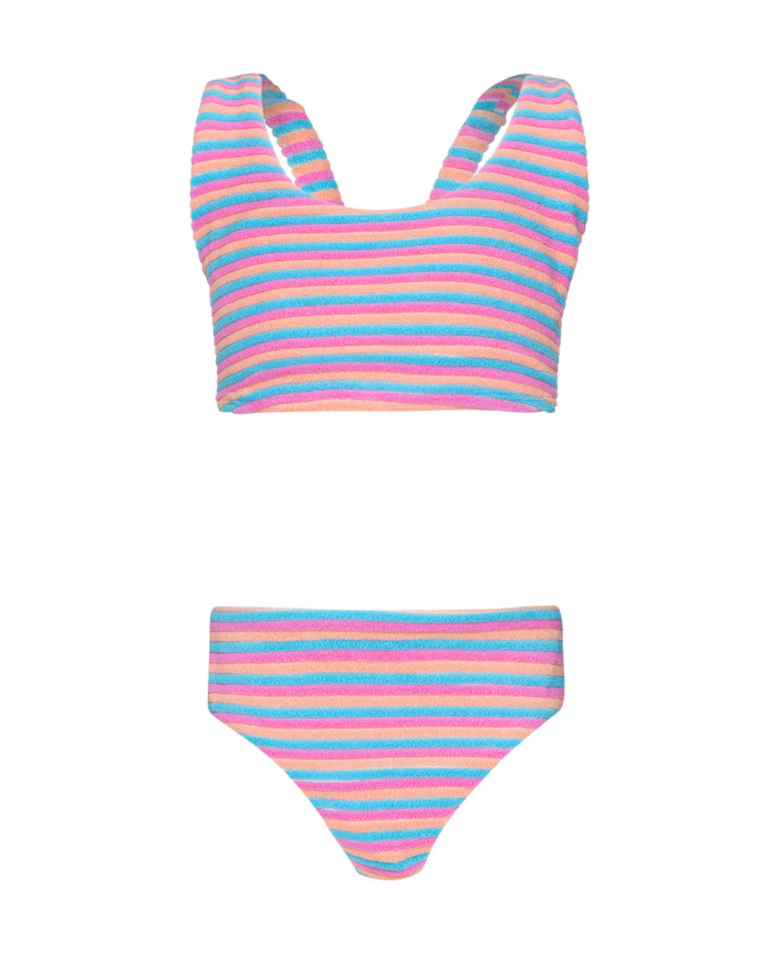 The Sherbet Finley Bikini brings a pop of playful color to her swim days. Crafted in soft terry cloth with cheerful striped colorblocking, this two-piece is as comfy as it is cute. Designed for all-day fun under the sun, from poolside splashes to sandy adventures.