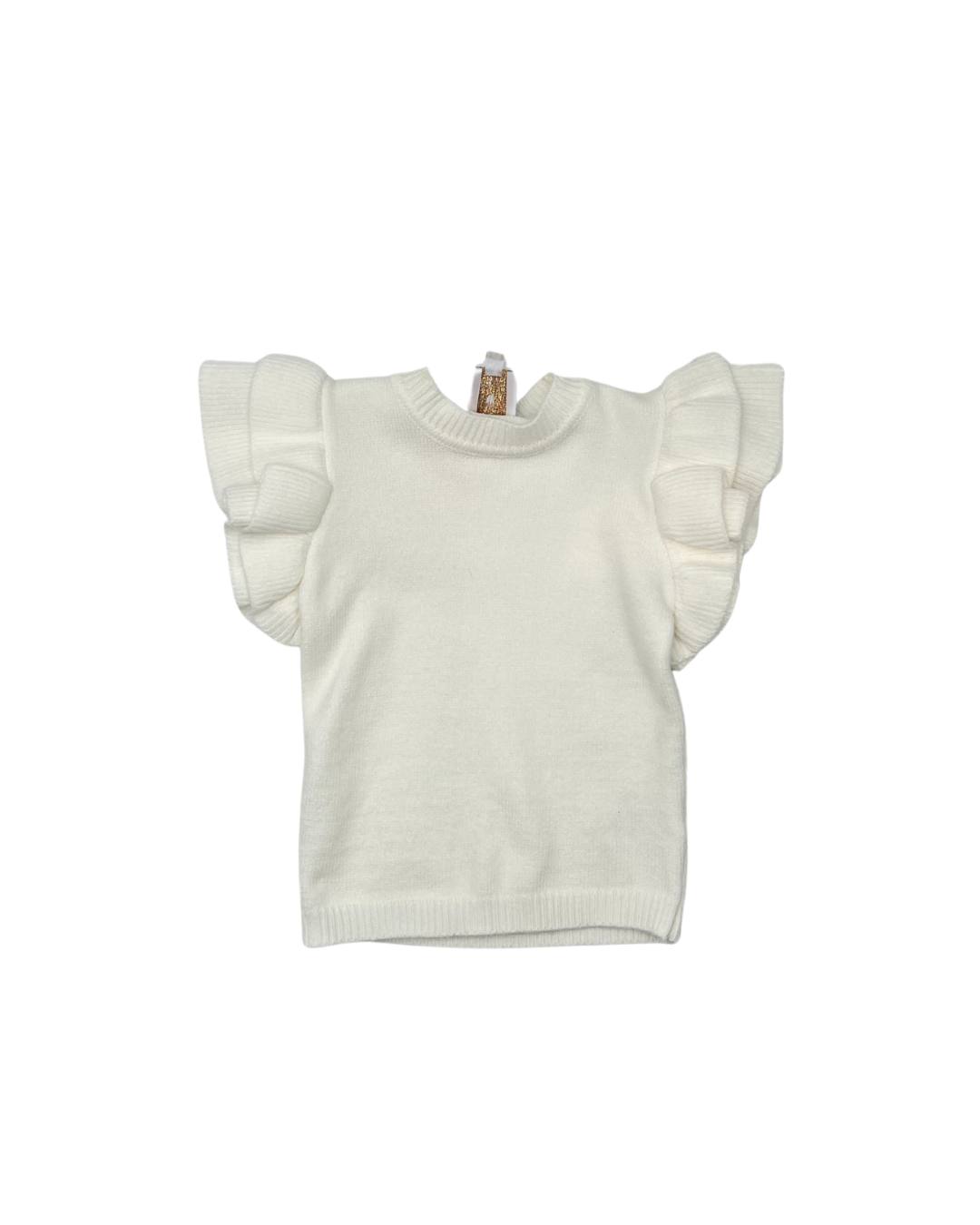 A sweet and stylish knit top featuring bold layered ruffle sleeves for a fun statement look. Available in classic ivory or vibrant pink. Perfect for pairing with jeans, skirts, or skorts.