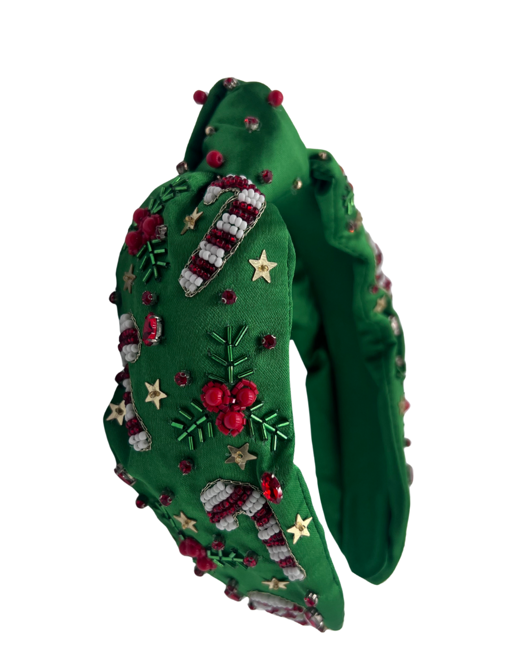A festive green satin headband adorned with candy canes and holly. Soft, stylish, and perfect for adding a holiday touch!