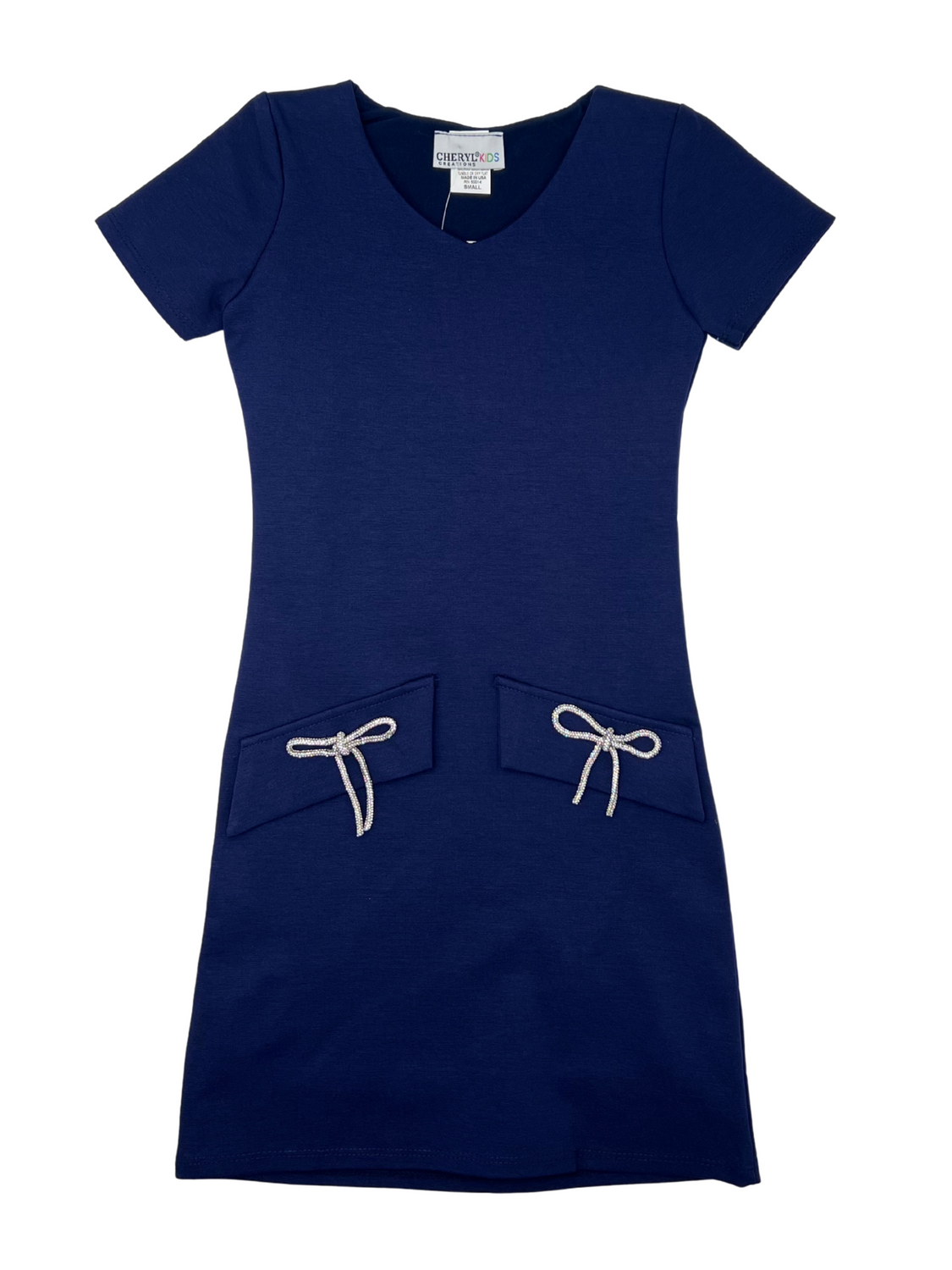 This simple navy dress is a must-have everyday piece. It features a flattering V-neckline, short sleeves, and playful front pockets accented with bow details. Easy to wear and super comfortable!
