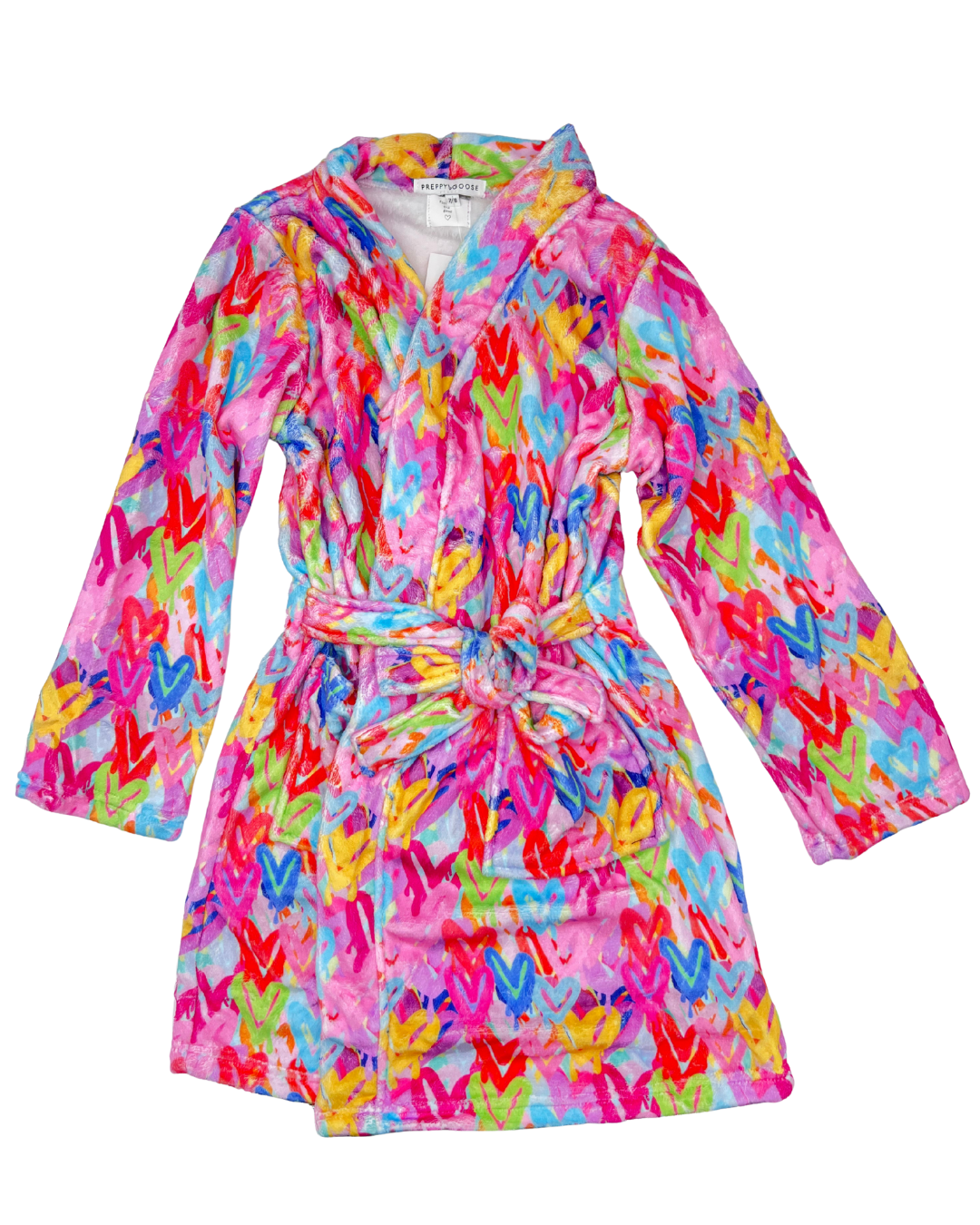 This Graffiti Hearts plush robe is ultra-soft, cozy, and covered in a fun heart design—perfect for lounging in style!