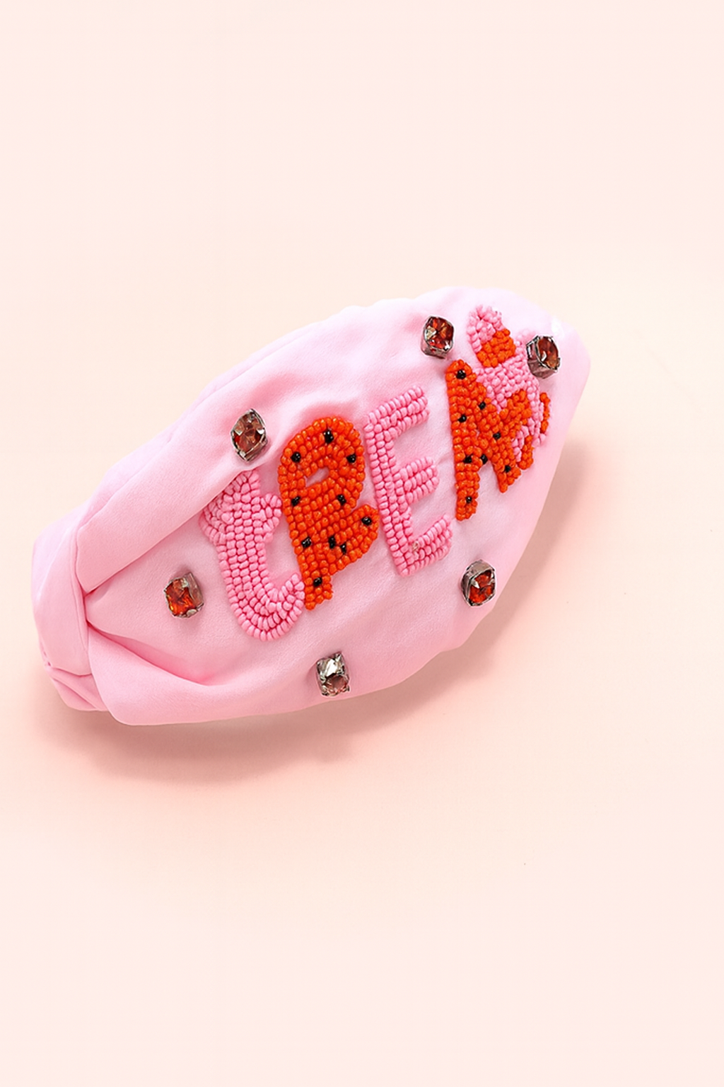 Pink padded headband with beaded “TREAT” lettering and rhinestone accents for a fun, sparkly touch.