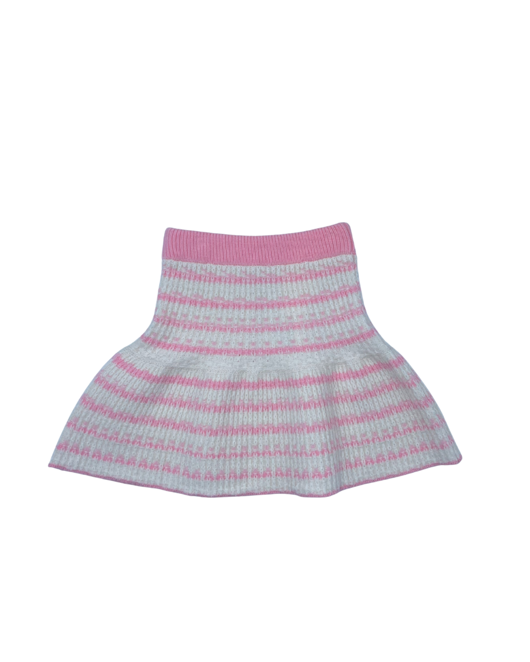 A playful knit skirt with soft stripes and a flared silhouette for easy movement. Available in pink or blue stripe designs, perfect for pairing with sweaters or tees for a cozy-cute look.