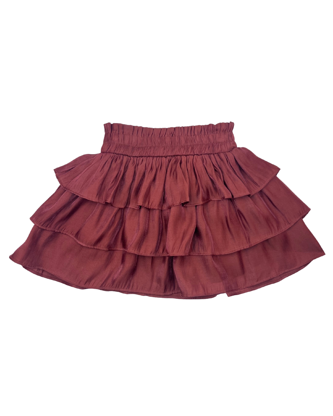 A precious shimmer tiered skirt with a flowy fit and sparkling accents, perfect for adding a touch of glam to any outfit. Runs true to size.