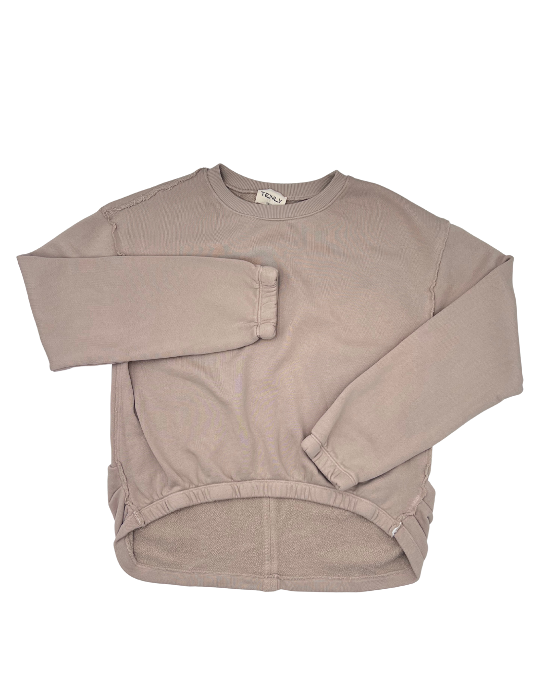 This cotton fleece tunic features raw edge details and side shirring for a comfy fit with a touch of style.