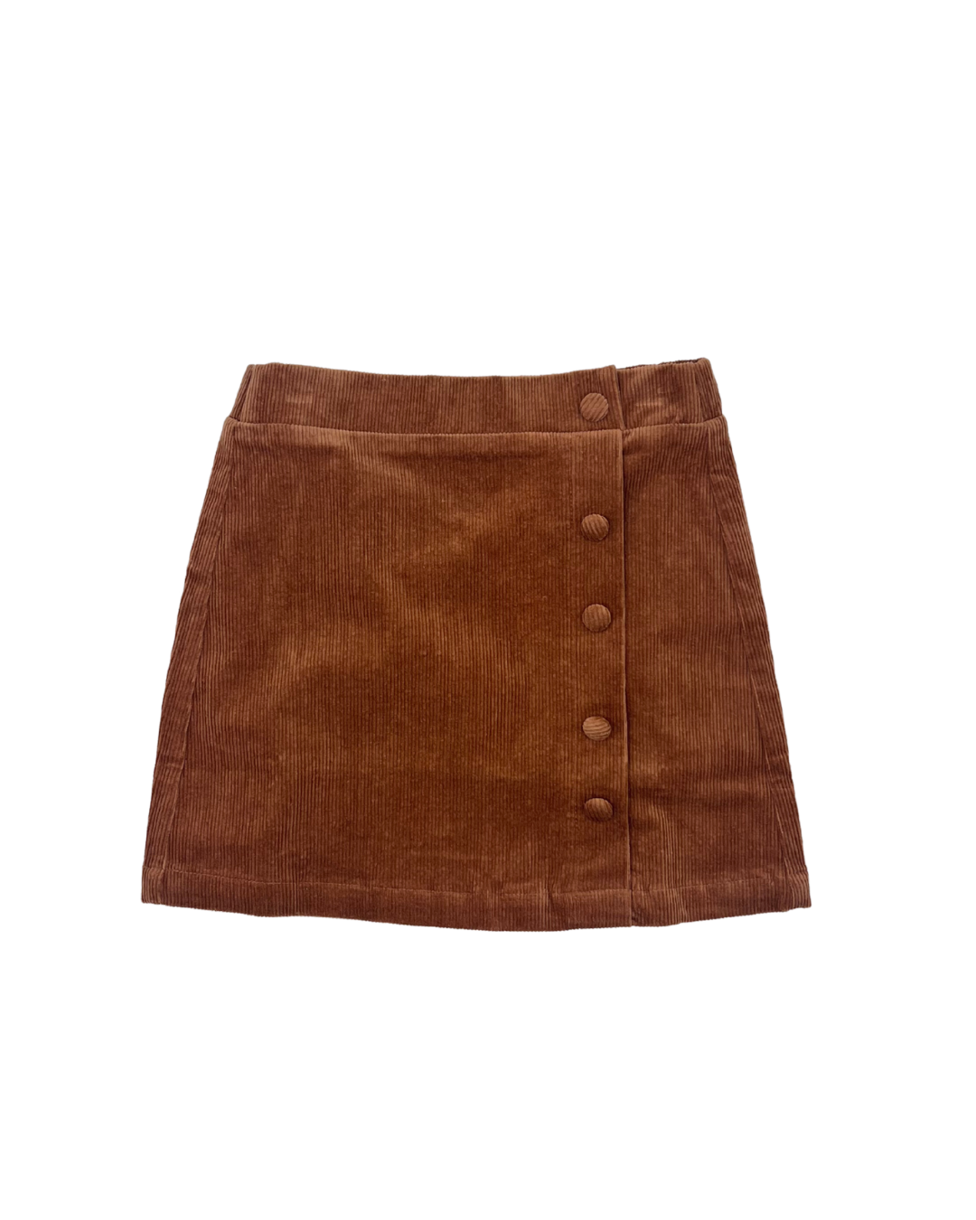Soft honey-colored corduroy pull-on skirt featuring an elastic back for comfort and easy wear.