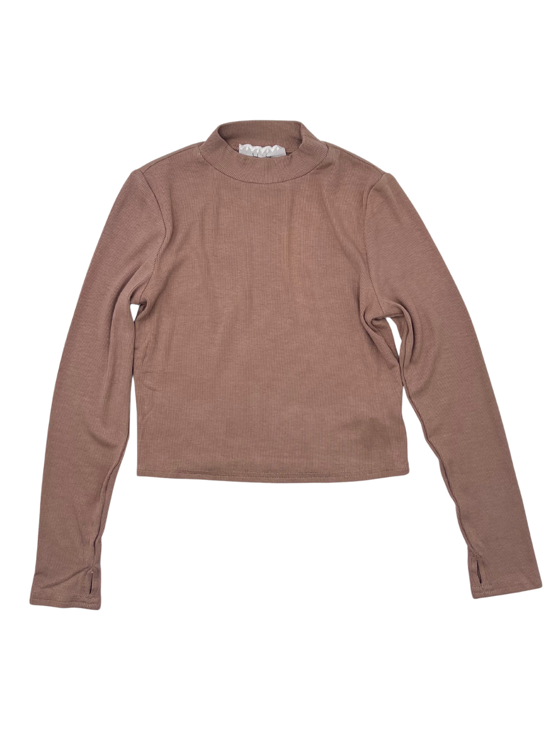 A trendy mock neck top with thumbholes for a cool, comfy, and stylish look—perfect for tweens on the go!