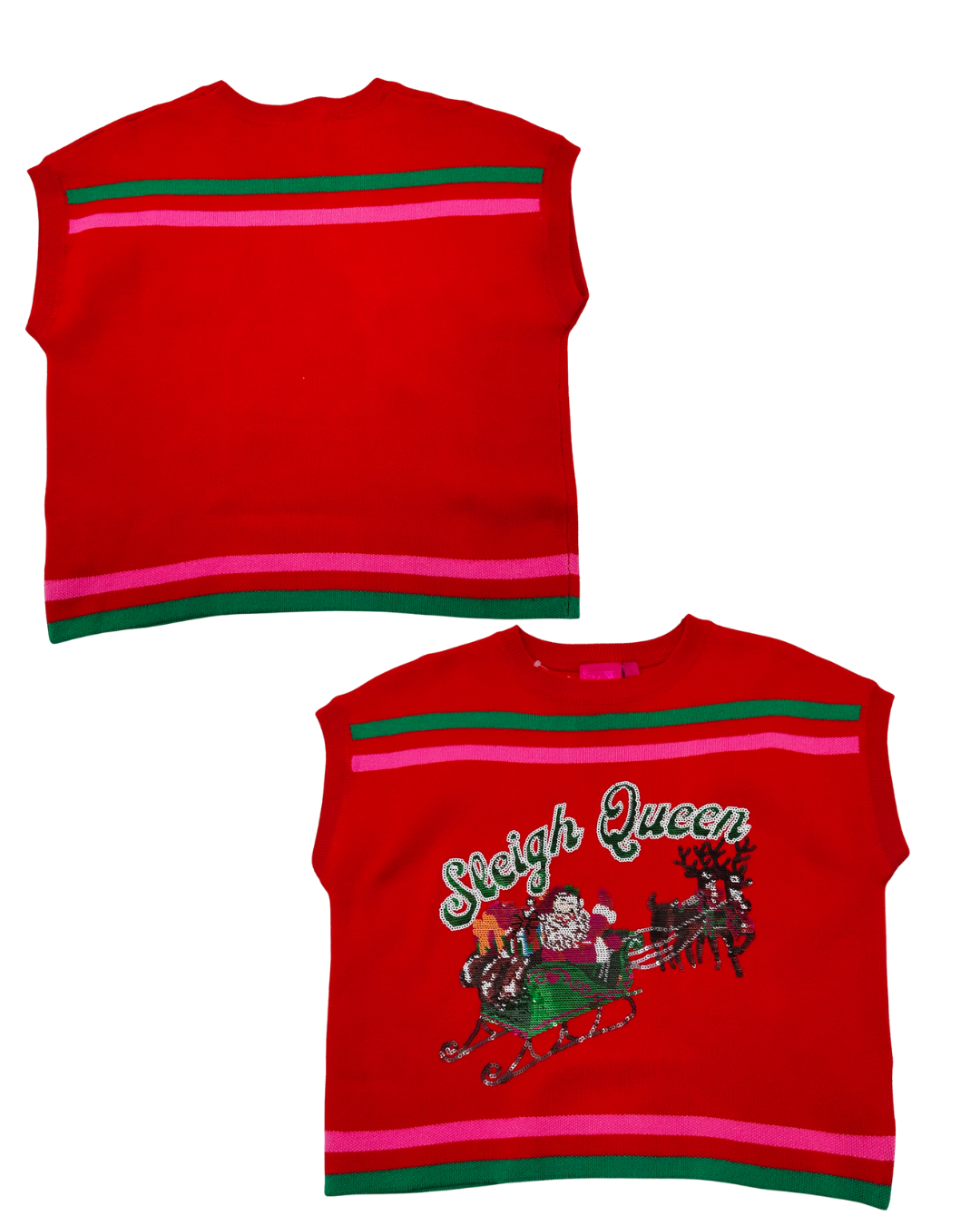 This Queen of Sparkles sweater top features “Sleigh Queen” across the front with festive Santa detailing—perfect for a standout holiday look.