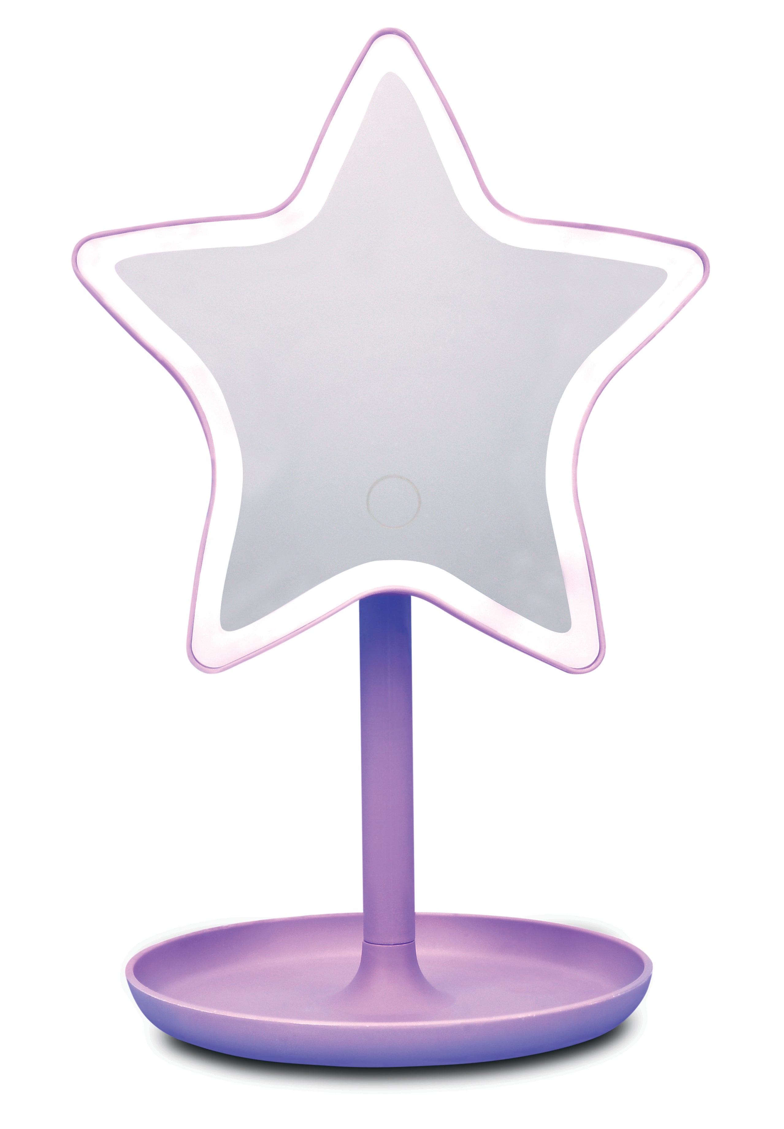 Star-shaped vanity mirror with a fun and whimsical design. A cute addition to any desk or vanity, perfect for touch-ups or display.