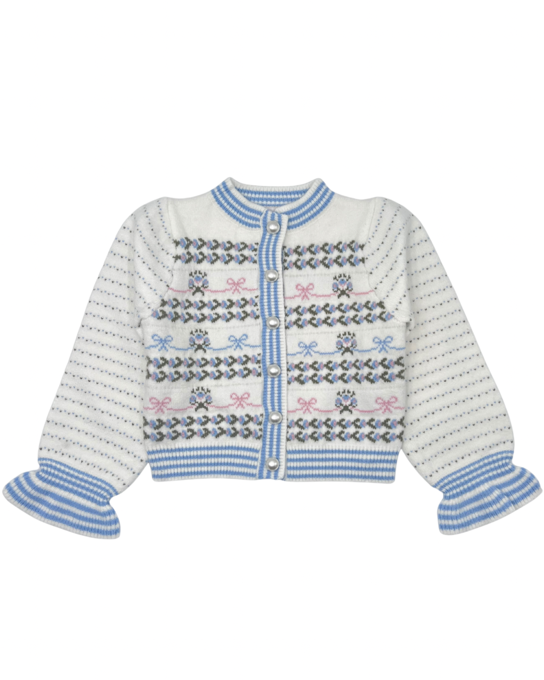 Adorned with sweet florals and bows, this cozy knit cardigan features pearl buttons and flared cuffs for a charming vintage look.