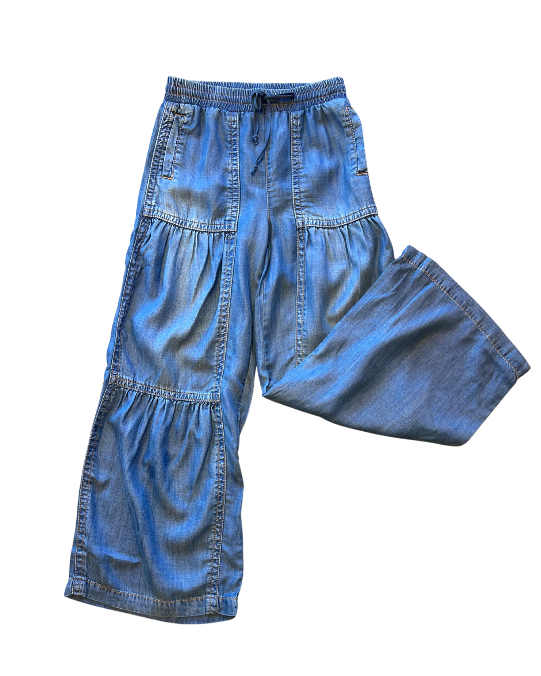 Effortless and stylish pull-on jeans with a tiered wide-leg design and adjustable drawstring waist. Perfect for laid-back days with a trendy twist!