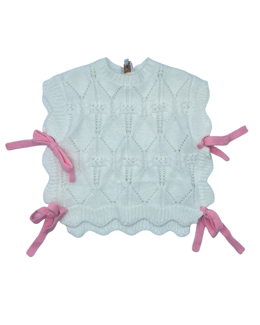 A cozy knit sweater vest with scalloped edges, diamond knit detailing, and sweet side ties. Available with pink or blue bows for a playful pop of color. Perfect for layering over tops or dresses.