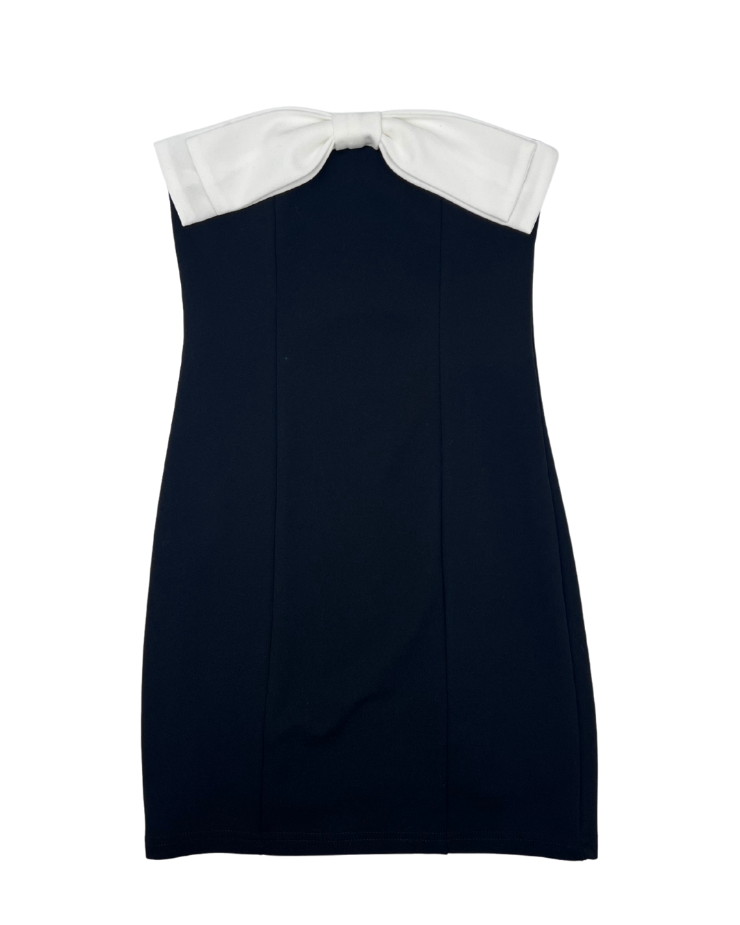 This two-toned dress features a bold color contrast and a sweet bow accent—perfect for a standout, stylish look.