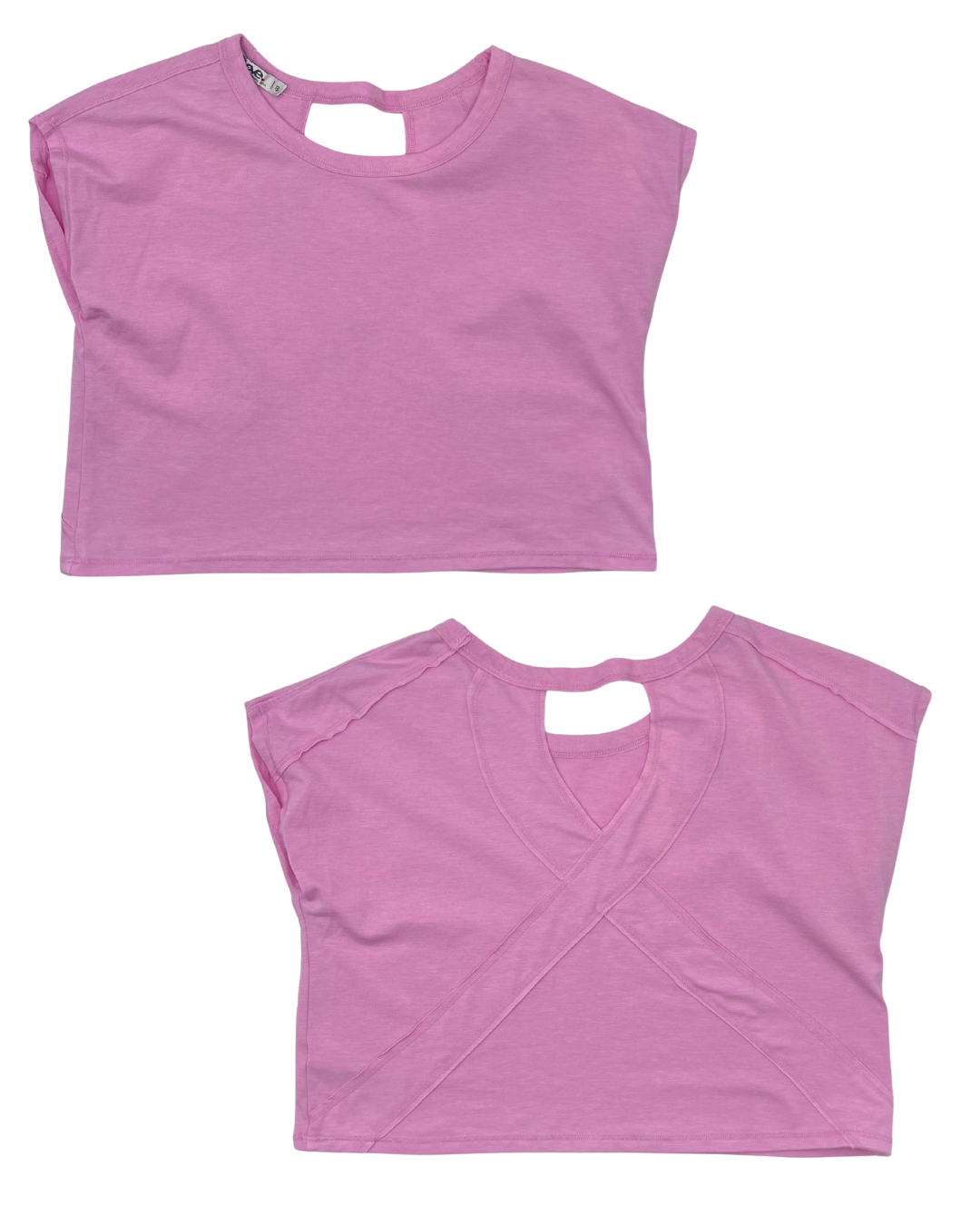 This short sleeve open back top adds a fun twist to a classic tee with its breezy, stylish back detail.